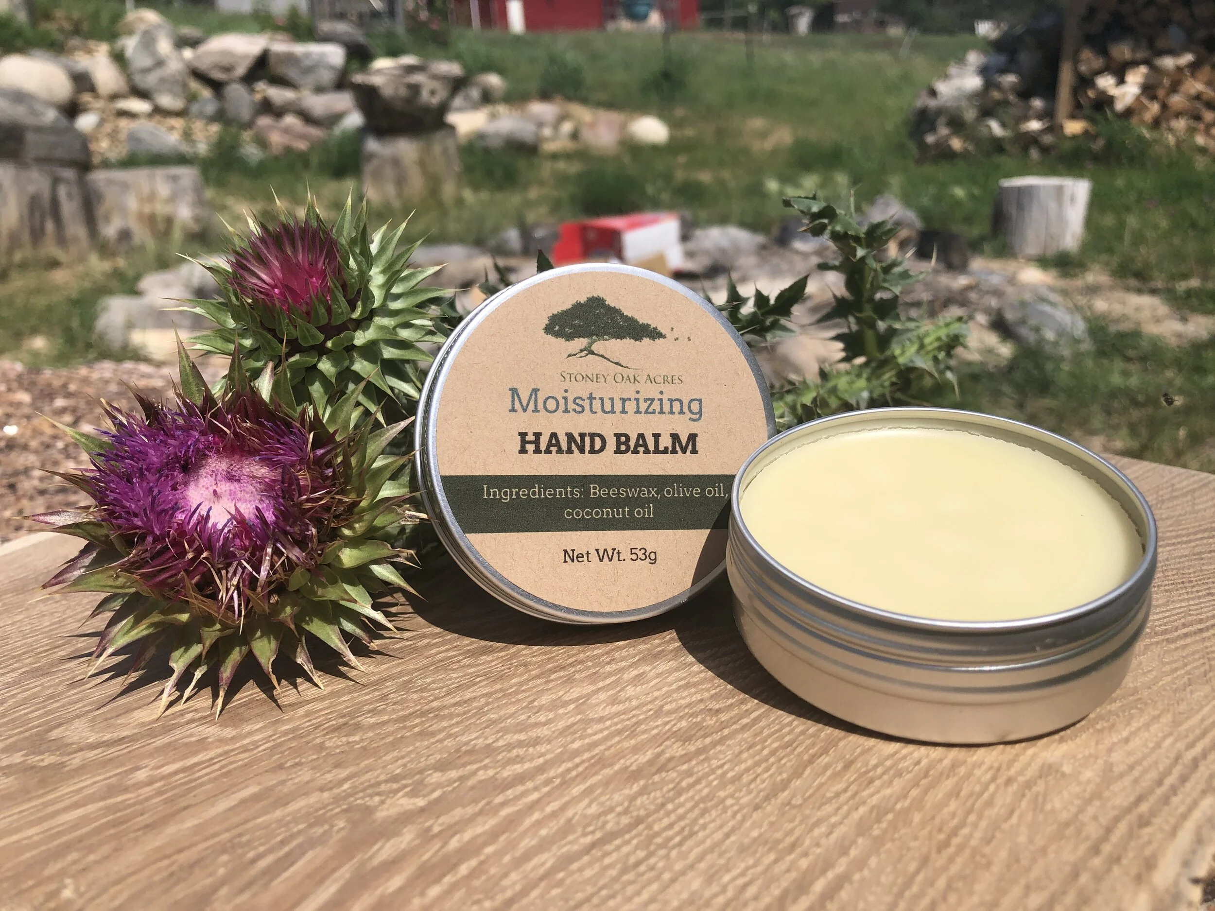 Soothing for dry, even cracked, hands.$5 for a 53g (Net Wt) tin Hand Balm - made with beeswax, olive oil and coconut oil - Net wt. 53g $5